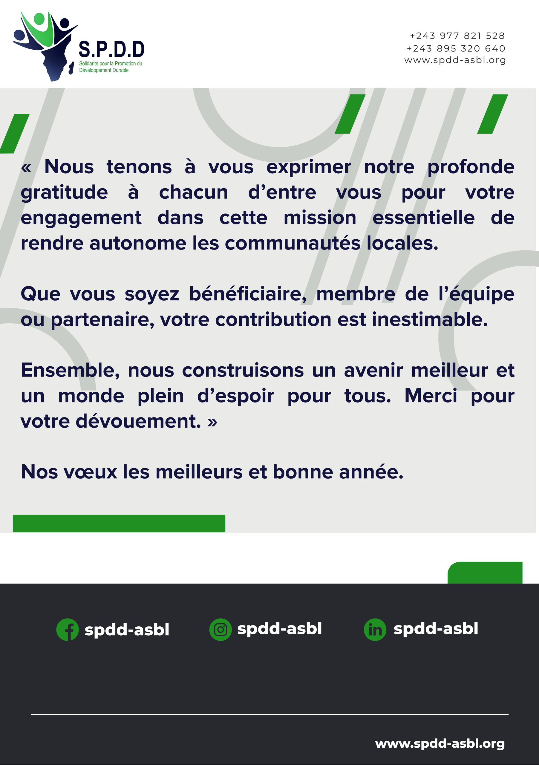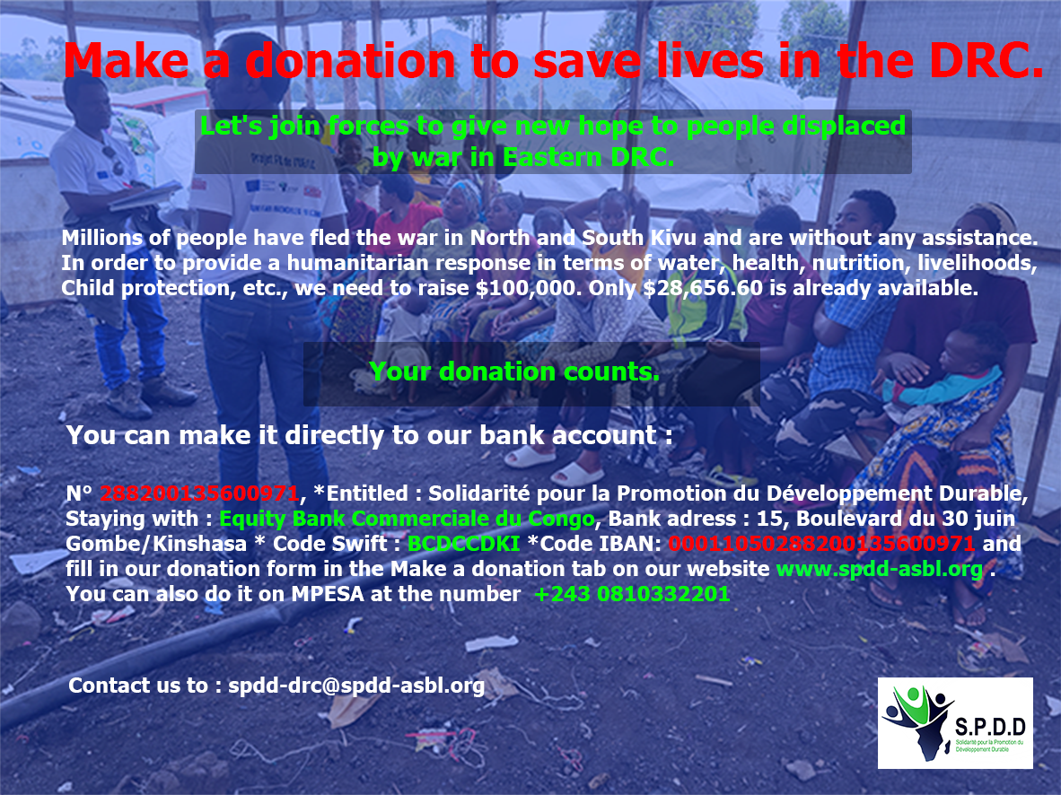 Nous sommes une organisation nationale sans but lucratif de droit congolais dénommée Solidarité pour la Promotion du Développement Durable SPDD en sigle.